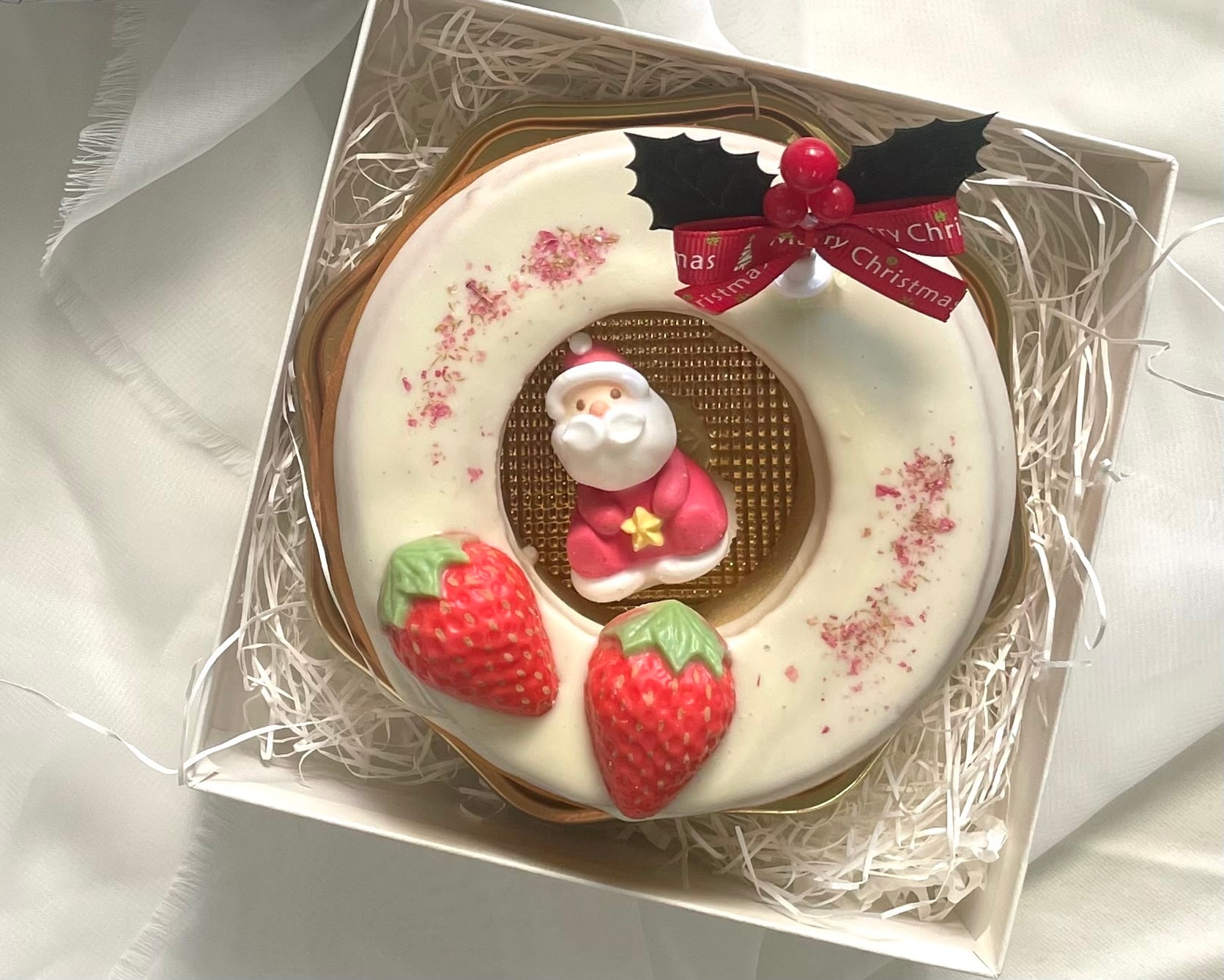心温まるクリスマスシーズンにぴったりの苺サンタのリースバウムが登場です!自家製の苺ピューレを贅沢に使った苺ミルクバウムをリースに見立てて仕上げました。