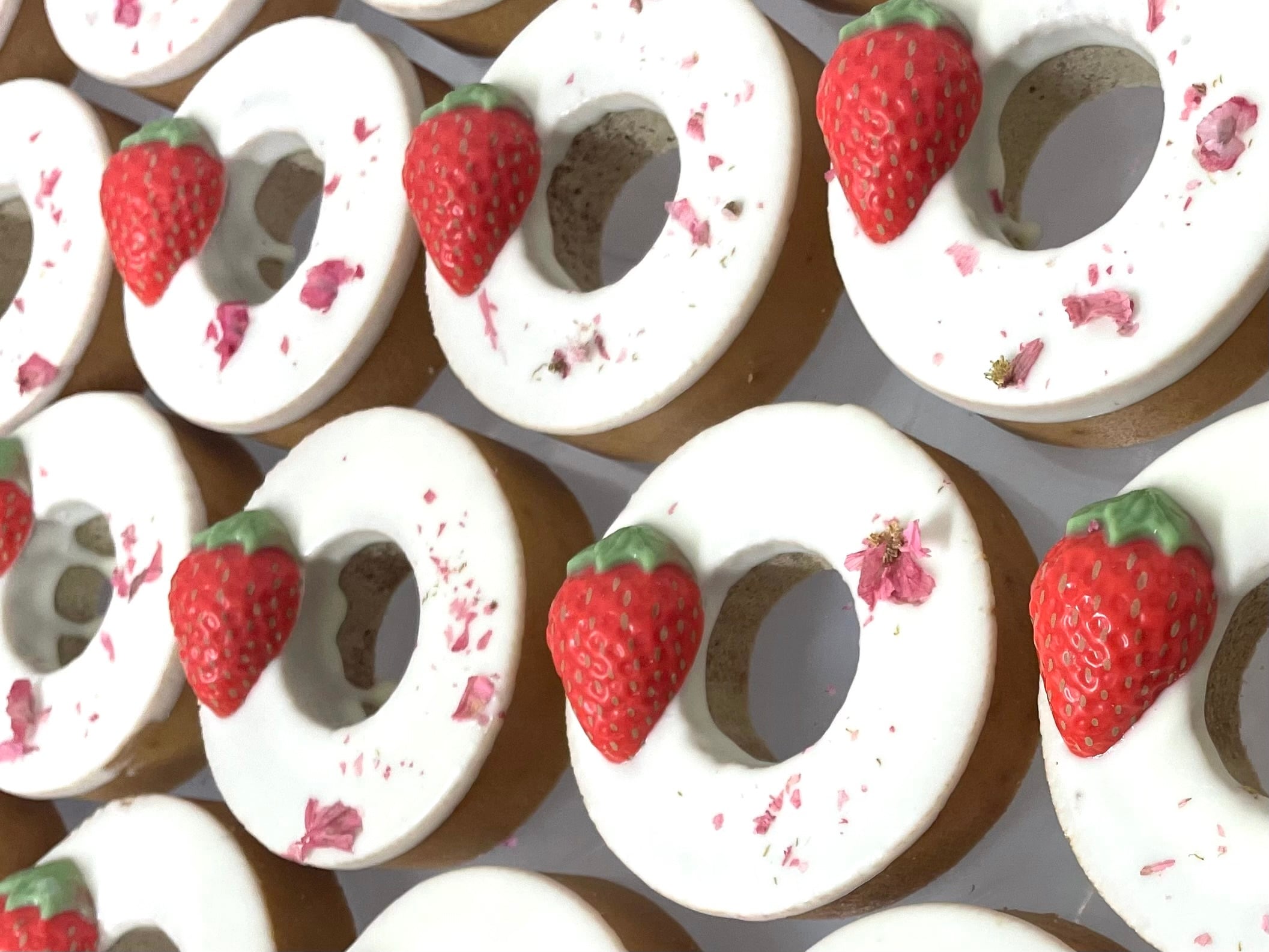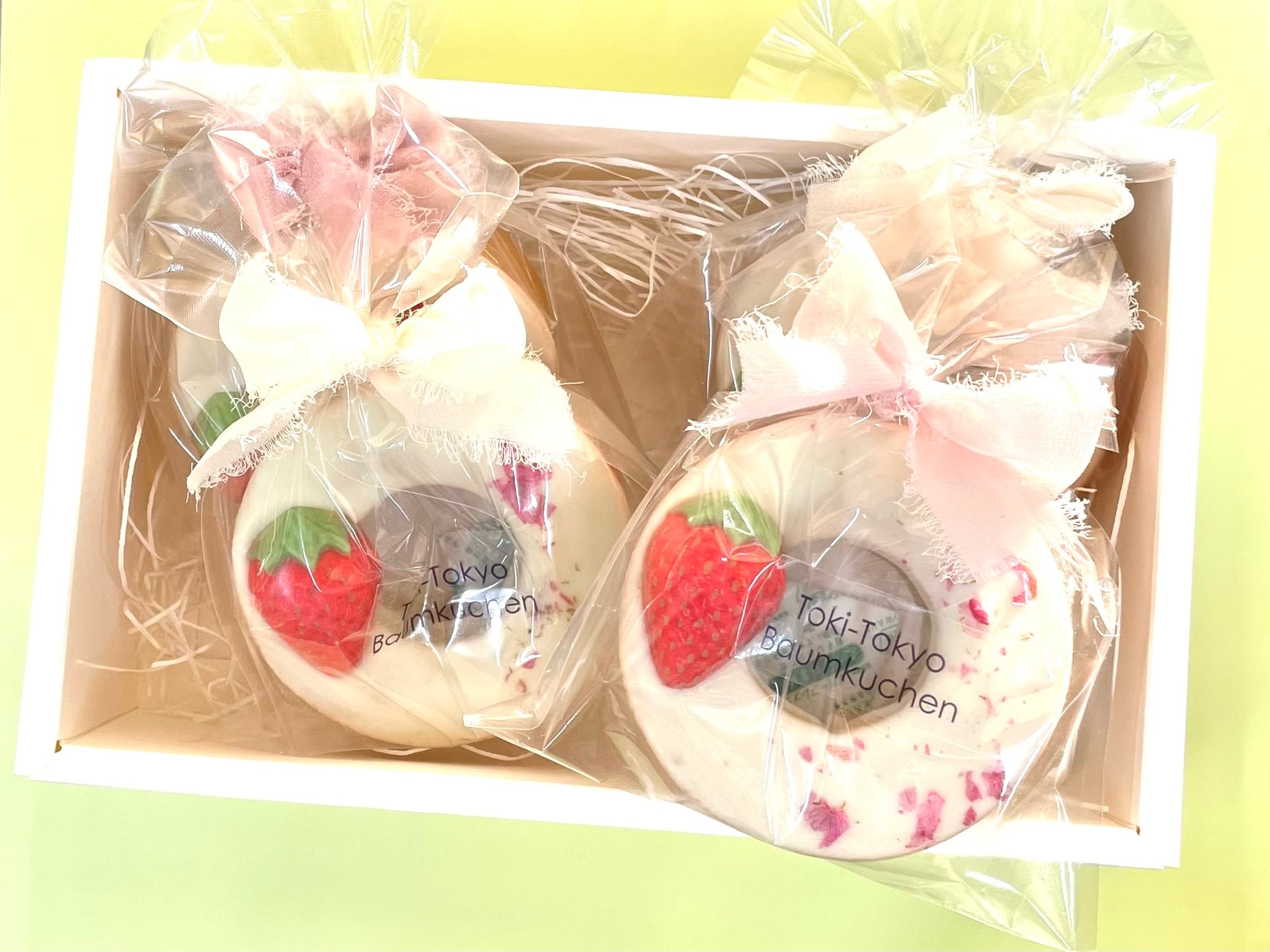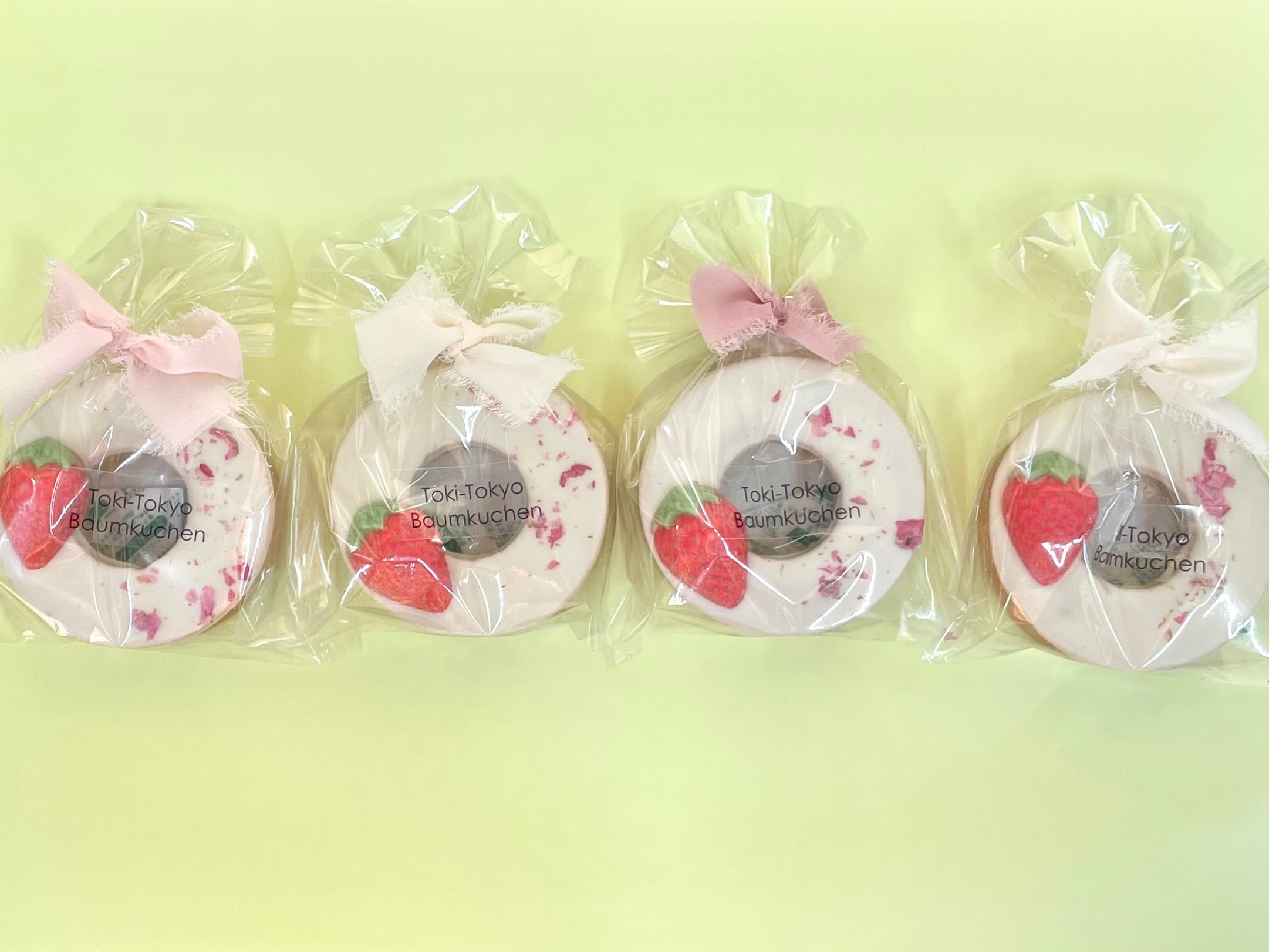 大人気の苺ミルクバウムが4個入りのBOXタイプで登場です!自家製苺ピューレと生クリームが入った苺ミルクバウムは、甘く優しい味わいです。苺の形の苺チョコレートを飾った、子供から大人まで思わず笑顔になる、贅沢バウム。仕上げはシフォンリボンをひとつひとつ丁寧に結んでいます。